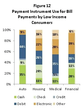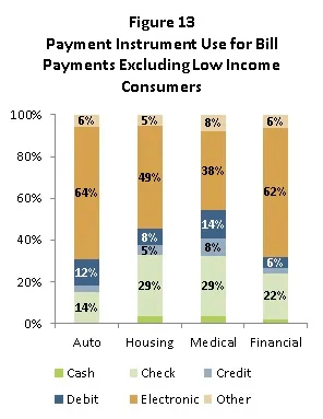 Although all consumers use cash approximately the same number of times a month regardless of income, those making less than $25,000 annually use cash for a much wider variety of transactions than do those with higher household incomes. These consumers typically have a higher number of monthly cash transactions with a ticket size valued at $25 or more than does any other household income group. Specifically, those making less than $25,000 annually have an average of 5.1 such transactions a month versus 3.2 for households earning more than $25,000. Consistent with this, the total value of low-income consumers' cash spending, at $558 per month, is much higher than any other income group's cash spending. Moreover, as Figures 12 and 13 show, low income consumers use cash much more frequently for bill payments like housing than the average consumer. This likely is due, at least in part, to a lack of access to banking and financial products. This finding is not surprising in light of various studies of “unbanked and underbanked” U.S. consumers, many of whom also fall into the lower-income category. For example, as a study by the FDIC found, low income consumers use cash because they view most mainstream banking and financial products as too expensive or too difficult to obtain.Footnote 5