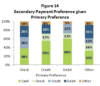 Not only does cash play an important role in small value transactions and as the primary payment instrument for low-income consumers, it also plays a significant role as the fallback payment instrument for most consumers. As Figure 6 above shows, cash was second to debit cards as consumers' payment instrument of choice. When asked about their backup payment instrument, however, most consumers who preferred a non-cash payment instrument declared cash as their second choice. Sixty percent of consumers who prefer the debit card, for example, picked cash as their second choice (see Figure 14). A similar observation holds true for other payment instruments.