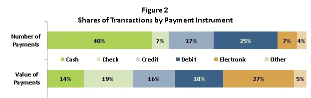 By value, cash accounts for a relatively small share of total consumer transaction activity at 14 percent, while electronic methods make up 27 percent and checks 19 percent. These findings suggest that although consumers don't use electronic methods or checks very often, when they do, it tends to be for much higher-value transactions. In contrast, cash is used quite often, but primarily for low-value transactions. In fact, the average value of a cash transaction is only $21, compared with $168 for checks and $44 for debit cards.