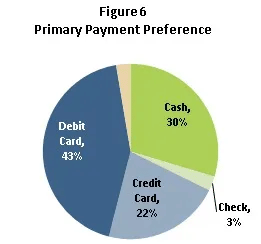 About 43 percent of consumers say that the debit card is their payment instrument of choice (Figure 6), and consistent with this stated preference, they do, in fact, use their debit card for the largest share of all their transactions (Figure 7). Similarly, 30 percent of consumers say they prefer cash and 22 percent say credit cards; in both cases, they use their preferred payment instrument for at least half of their transactions. Checks, however, are an anomaly: the 3 percent of consumers who prefer checks actually use cash twice as often as they use checks. This may reflect subtle (and not so subtle) social pressures to use a faster alternative to the check for the point of sale transactions that make up a large share of consumers' everyday expenditures.