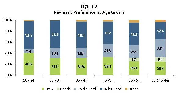 3While the preliminary results show distinct patterns in preference across age groups, it should be emphasized that the study has been done only once thus far and, as a consequence, the data cannot discern the effect of age on a person's preferences as he or she grows older. Recurring studies that follow the same or similar pool of survey participants would allow for analysis of how a person's choice can change as he or she gets older and, as a corollary, how the stated preference across age groups translates to the actual instrument used in making payments over time.