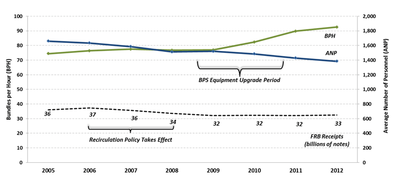 Second, relatively modest investments in cash processing technology have dramatically increased the productivity of Federal Reserve cash processing equipment and resulted in significant cost savings. As shown by the green line in Figure 1, productivity, measured by the number of one thousand note bundles processed each hour (Bundles per Hour, BPH), has grown by more than25 percent since 2007. As a result, the number of cash staff (Average Number of Personnel, ANP) has continued to fall even beyond the impact of implementing cash depots. While these investments in new technology increased annual equipment depreciation by approximately $2.5 million per year starting in 2010, they also yielded nearly $12.3 million in avoided personnel costs from 2010 through 2012, resulting in net savings of approximately $6.8 million over three years.