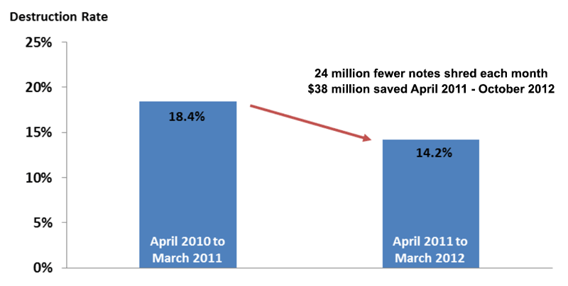 Third, the Federal Reserve has implemented new technology that better differentiates notes that can be re-used from those that should be destroyed, regardless of whether the notes are face up or face down during processing. Prior to this change, it had been more efficient to destroy any notes that inadvertently faced downward, even if they were nearly new. Now, notes are destroyed only when they fall below the Federal Reserve's quality standards, and the Federal Reserve accepts deposits (and makespayments) of $1 through $20 notes in any orientation, with the portrait face up or face down. This change reduced the annual currency print order (and the amount of shredded currency needing disposal), while ensuring that the physical quality of currency remains fit for commerce. As seen in Figure 2, the new approach prevents the premature destruction of nearly 24 million notes each month, and saved nearly $40 million from implementation in April 2011 through October 2012.