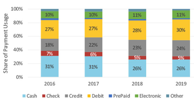 - Consumers used cash for 26 percent of all payments, consistent with the finding from 2018