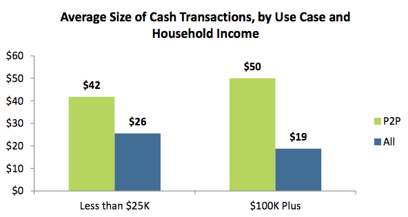2The average value for person to person (P2P) payments is slightly different than the average value for the spending category “Gifts and transfers to people” from Table 1, which includes a sub spending category called “People who provided goods and service.” Since this sub category is a payment for goods or services rather than a P2P transfer to another person, it is excluded in the average P2P calculation.