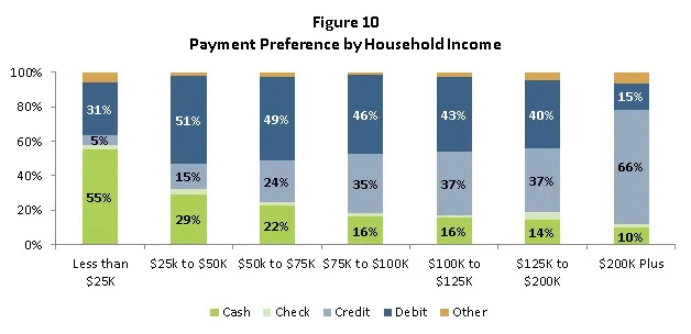 As Figure 10 shows, 55 percent of consumers with household incomes less than $25,000 per year prefer cash over non-cash payment instruments, while those households making more than $200,000 per year exhibit a very strong preference for credit cards.Footnote 4 The preference for cash declines sharply once household income exceeds $25,000 per year, with debit cards cited as the preferred payment instrument for all those in household income groups between the two extremes.
