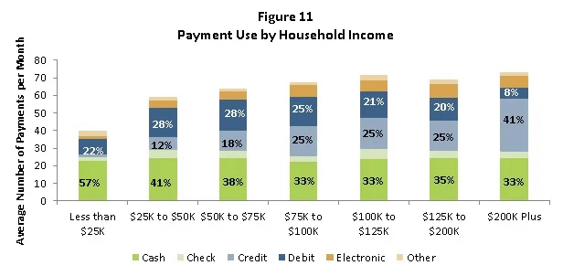 Consistent with payment preference, Figure 11 shows that the highest income group uses credit cards for more than 40 percent of their monthly transactions — much more frequently than any other payment option. This likely is due to the fact that more affluent consumers tend to have better access to credit and financial services and can take advantage of the incentives card issuers offer for using credit cards. At the same time, the lowest income group uses cash far more frequently than all other options combined. What is surprising, however, is that, despite the declining preference for cash as income rises, all income groups use cash for around 22 transactions per month.