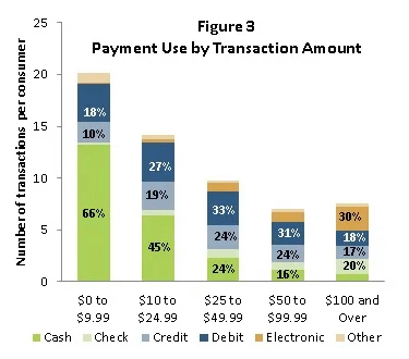 By value, cash accounts for a relatively small share of total consumer transaction activity at 14 percent, while electronic methods make up 27 percent and checks 19 percent. These findings suggest that although consumers don't use electronic methods or checks very often, when they do, it tends to be for much higher-value transactions. In contrast, cash is used quite often, but primarily for low-value transactions. In fact, the average value of a cash transaction is only $21, compared with $168 for checks and $44 for debit cards.