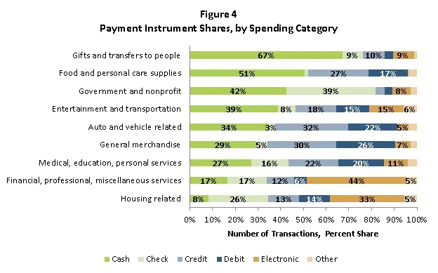 As shown in Figure 4, cash is the leading payment instrument for several expenditure categories, including gifts and other transfers between people (P2P); food and personal care supplies; entertainment and transportation; medical, educational, and personal services; and government and nonprofit expenditures. It is the second most frequently used payment instrument for all other categories except housing (and a distant second for financial and professional services). The average ticket size (see Appendix 1) for many of these expenditure categories is relatively low, suggesting that the reason cash is the most or second-most frequently used payment instrument is because small value transactions tend to dominate these categories. Moreover, the fact that debit cards tend to be used frequently for these expenditures as well indicates that cash usage likely is not the result of a lack of access to alternative payment options.