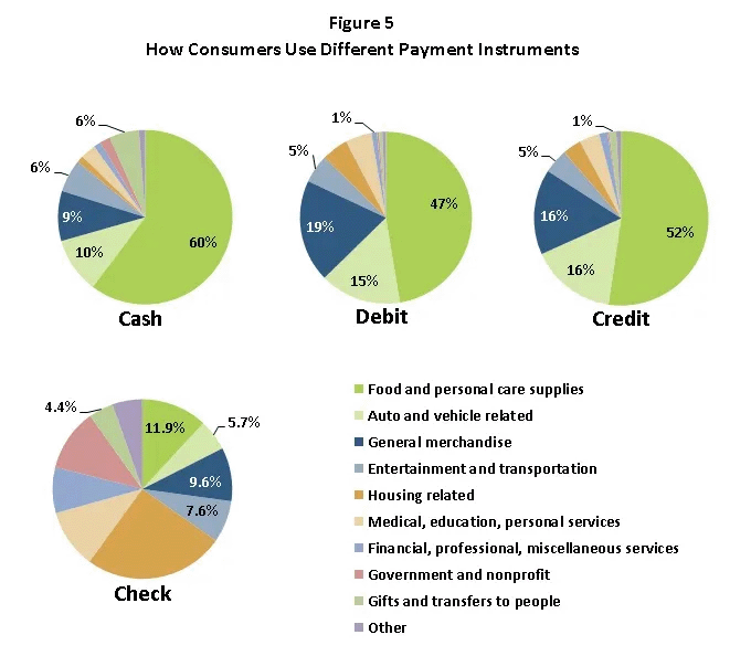 Figure 5 provides more evidence that consumers do not use cash as a niche payment instrument, but actually use it in similar ways to debit and credit cards. Specifically, food and personal care supplies make up 60 percent of all cash transactions, with entertainment and transportation, general merchandise, and auto and vehicle related expenditures collectively accounting for an additional 26 percent of cash transactions. The breakdowns by expenditure category for credit and debit cards look similar to that of cash, with food and personal care items making up the largest share of consumers' use of these instruments, as well. In contrast, consumers seldom use checks for these sorts of day-to-day expenditures.
