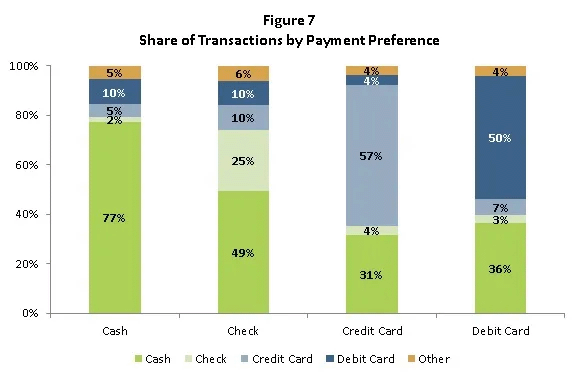 Figure 7 also shows that when they do not use their preferred instrument, consumers who prefer debit and credit cards use cash more frequently than any other payment instrument. While one might expect consumers to treat debit and credit cards somewhat interchangeably, that does not appear to be the case. Consumers who prefer debit cards, for example, use cash 36 percent of the time, while the same group uses credit cards for only 7 percent of their transactions.