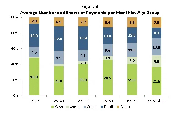 Figure 9 also shows that there is a significant substitution between check and debit, with older age groups tending to use checks much more frequently than debit cards and vice versa for younger age groups. This finding is not surprising given that check preference is highly correlated with age.