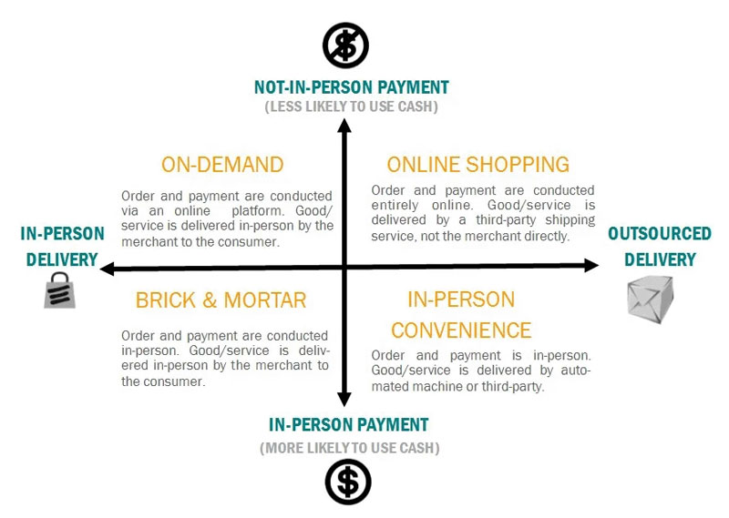 Classifying transactions in this manner creates four possible shopping pathways: “brick-and-mortar,” “online shopping,” “in-person convenience,” and “on-demand.” While “brick-and-mortar,” “online shopping,” and “in-person convenience” are all well-established pathways, the “on-demand” quadrant has only emerged in recent years. Two of these four quadrants (“on-demand” and “online”) typically involve a website or mobile app for making payments and therefore do not provide an option for paying with cash. Consequently, how a consumer shops affects how a consumer pays.
