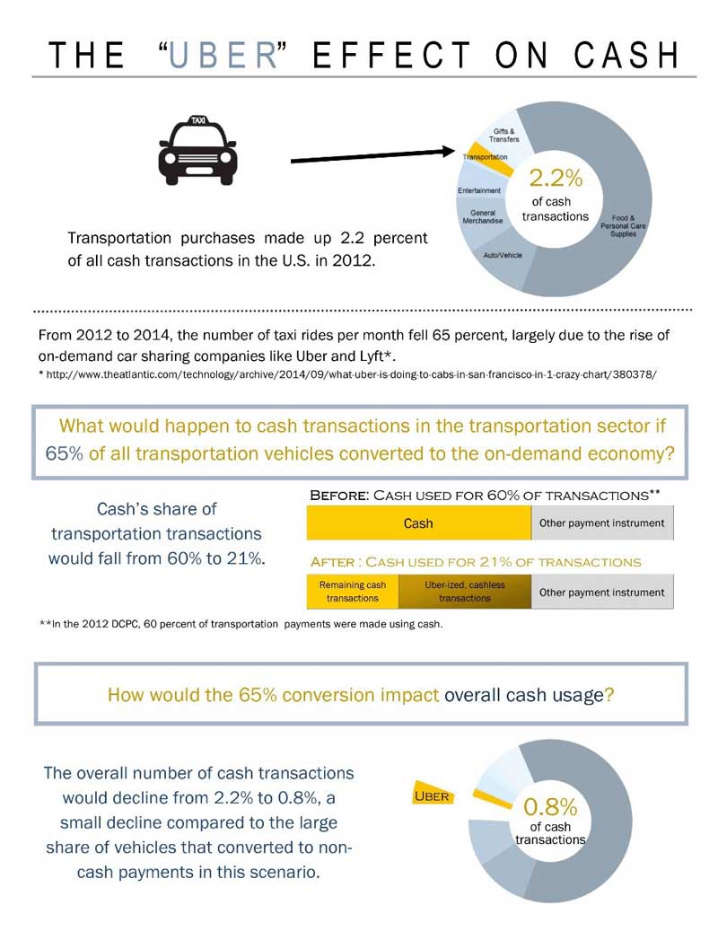 Our infographic shows that a national expansion and adoption of Uber would reduce cash usage by only 1.4 percentage points. The effect of the on-demand economy on transportation cash may be strong, but its impact on overall cash use is limited.